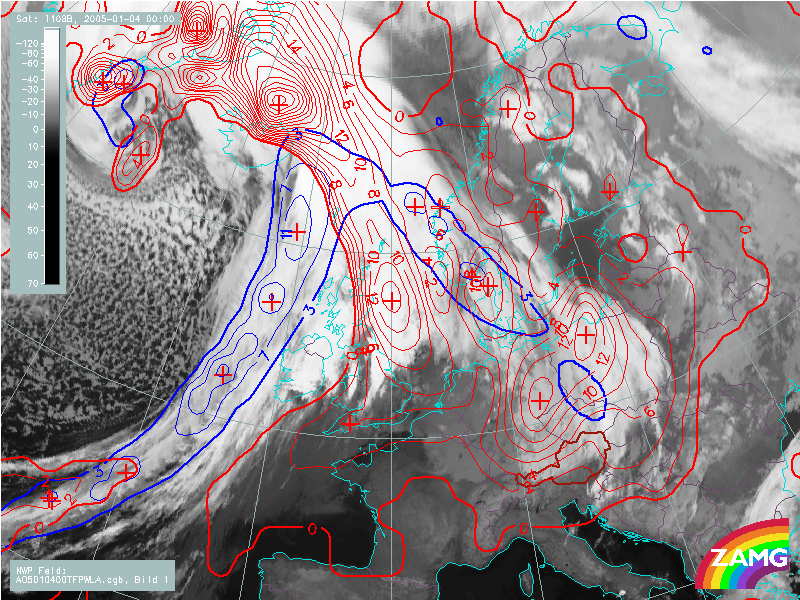 04 January 2005/00.00 UTC - Meteosat 8 IR 10.8 image; blue: thermal front parameter 500/850 hPa, red: temperature