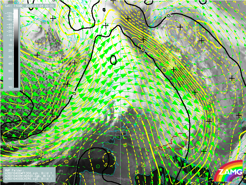 04 January 2005/00.00 UTC - Meteosat 8 IR 10.8 image; yellow: isotachs 300 hPa, black: zero line of shear vorticity 300 hPa