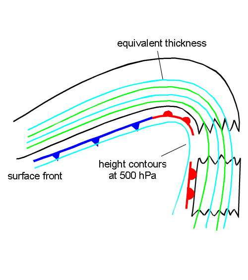 In the case of an eastward moving classical frontal system the Detached Warm Front is mostly observed within the eastern branch of a pronounced synoptic scale ridge in the height and thickness fields, accompanied by strong winds in higher levels of the troposphere (approximately at 500 hPa) which blow normal to the movement of the ridge system.