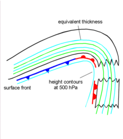 A different view of the development and maintenance of a Detached Warm Front cloudiness is given by the conveyor belt model. For the Detached Warm Front, a rising warm conveyor belt, as already described in detail in the Warm Front chapters, is also the dominant feature. It is the same relative stream which is involved in the band- and shield-formed Warm Front. The cloudiness of the Detached Warm Front appears where the relative streams turn from the northern culmination point to south, south-western directions. But there are two main differences between the classical and the detached types. While in the band and shield type the Warm Conveyor Belt is sinking in the area just described, it is rising in the area of the Detached Warm Front. The reason for this may be the strongly inclined frontal zone, indicated in the high gradient zone of the thickness, as well as in the isentropes of a vertical cross section (see Typical appearance in vertical cross section). In the classical types either no frontal zone (band type) or a weakening (shield type) appears in the area under consideration. A second difference can be found in the location and orientation of the Warm Conveyor Belt which seems to be more to the south of the synoptic scale ridge, which leads to the fact that the rising Warm Conveyor Belt overruns the frontal line in the area of the Detached Warm Front. However, more investigations will be necessary.