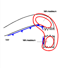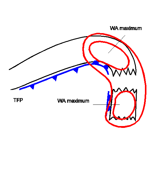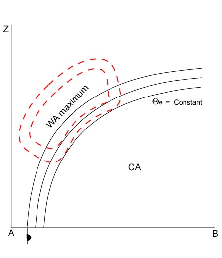 A possible and often observed indication for the formation of a Detached Warm Front is a splitting of the wind field within the mid- and upper levels of the troposphere in the area of the Warm Front into a north-western and a strong southern stream. This causes the cloud field of the Detached Warm Front to move more or less rapidly southward within the eastern branch of the upper level ridge which is, in this case, very close to the high gradient zone of equivalent thickness. The original frontal system, which is situated further north, moves from west to east. Consequently the different air streams cause two WA maxima. WA maxima contribute to upward motion which is one reason for the maintenance of cloudiness.