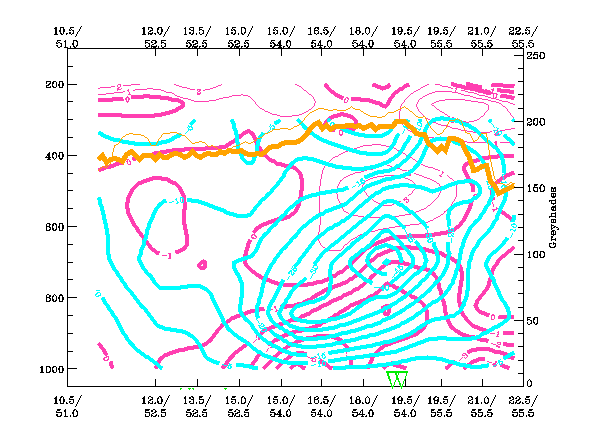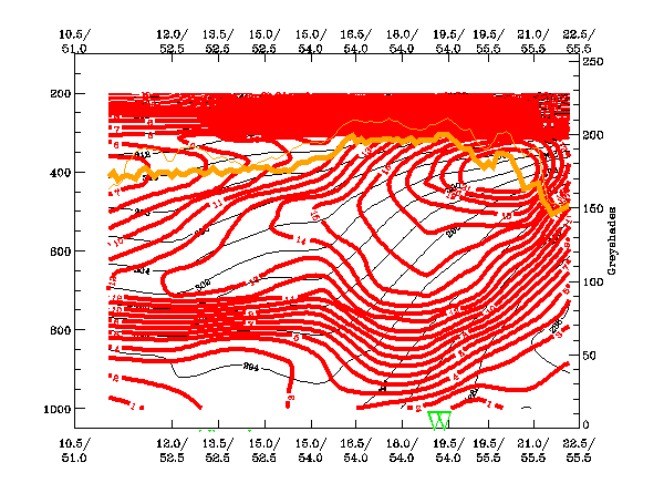 04 January 2005/00.00 UTC- Vertical cross section; black: isentropes (ThetaE), red thick: temperature advection - WA, red thin: temperature advection - CA, orange thin: IR pixel values, orange thick: WV pixel values