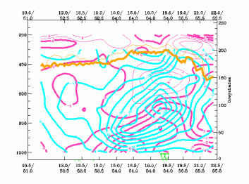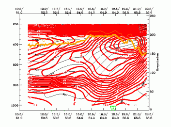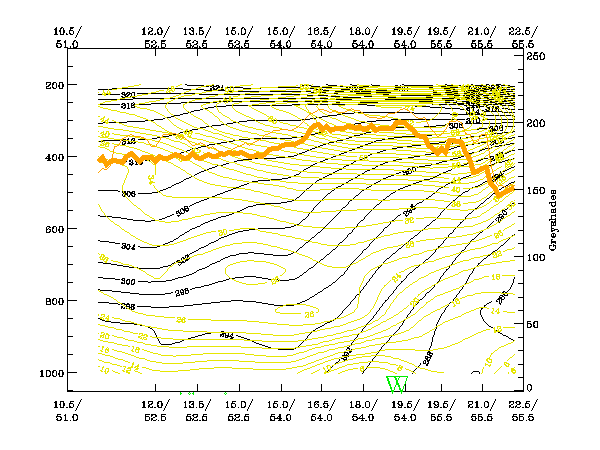 04 January 2005/00.00 UTC - Vertical cross section; black: isentropes (ThetaE), yellow: isotachs, orange thin: IR pixel values, orange thick: WV pixel values