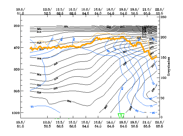 04 January 2005/00.00 UTC- Vertical cross section; black: isentropes (ThetaE), blue: relative humidity, orange thin: IR pixel values, orange thick: WV pixel values