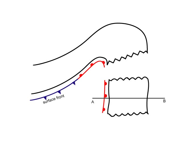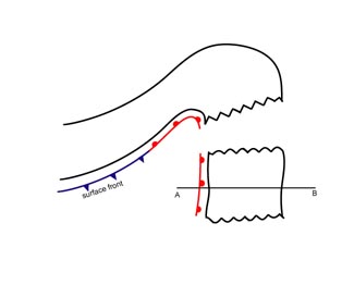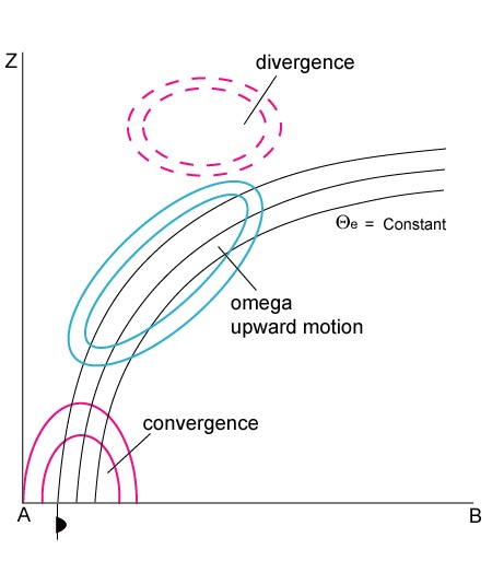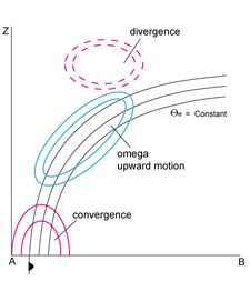 Well developed fronts are accompanied by a zone of distinct convergence within and divergence above the frontal zone. Consequently, upward vertical motion can be found above the frontal zone, responsible for cloud development.