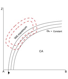 Like the distribution of humidity, the field of temperature advection can also be separated into two parts. WA exists above and within the high gradient zone of the Warm Front. The maximum of the WA can be found within the high gradient zone where it often has several maxima from low up to high levels. On the other hand CA can be found below and in front of the high gradient zone. In actual cases the isentropes forming the lower boundary of the frontal surface do not represent the transition from WA to CA, but WA can also mostly be found far below the frontal surface while CA exists only at a larger distance from the surface front.