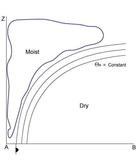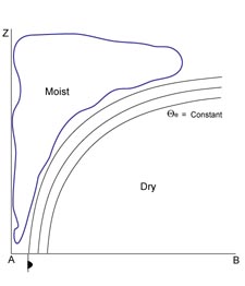 As described before, the isentropes of the equivalent potential temperature across the Detached Warm Front show a high gradient zone through the whole troposphere, which is inclined upwards from low to high levels. The colder air can be found in front of and below the high gradient zone, the warmer air being in front, and above it (see Meteorological physical background).