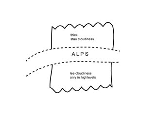 Due to the orography in central Europe, the cloud field of the Detached Warm Front is moving against the northern or the windward side of the Alps and therefore Stau effects are superimposed (see Barrage cloud ) causing increased weather events there (see Weather events).