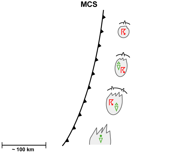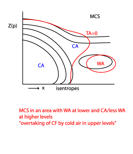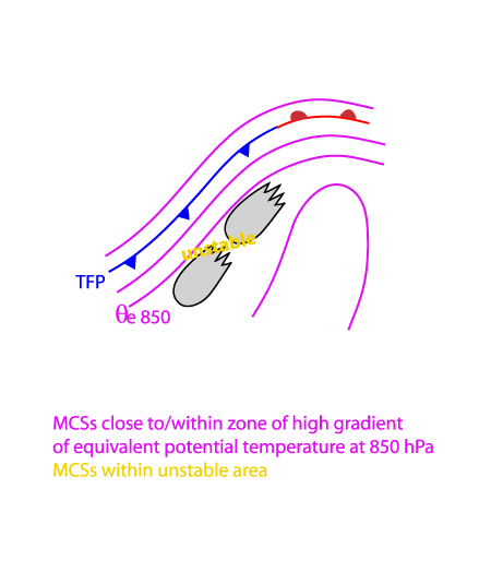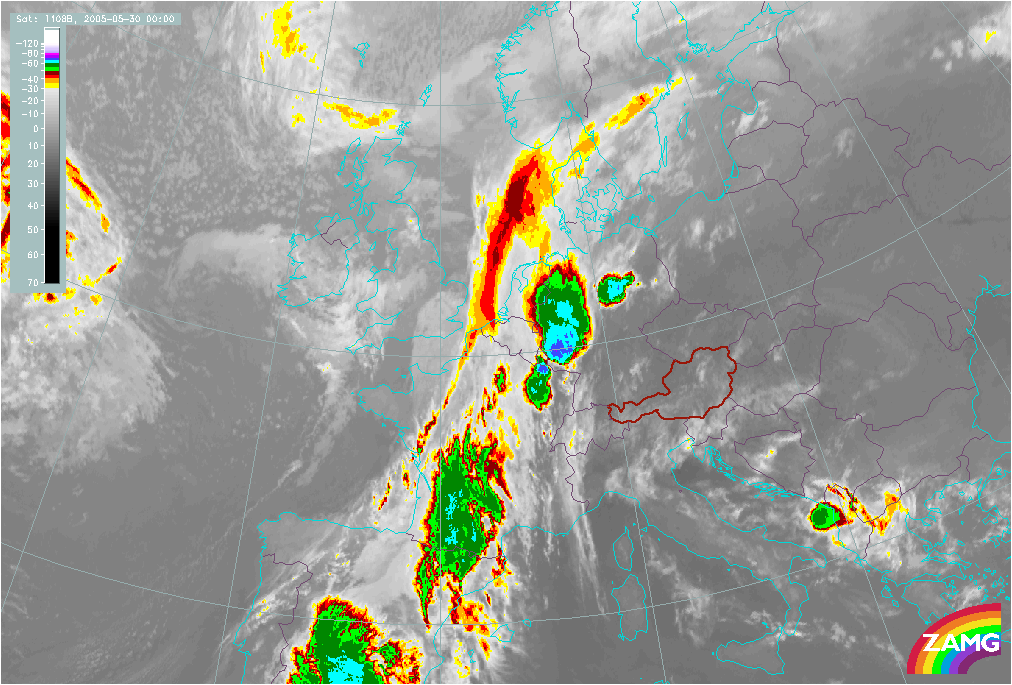 The image below shows extended MCSs over Germany, the Netherlands and the Elzas, lying along the leading edge of a cold front clouds.