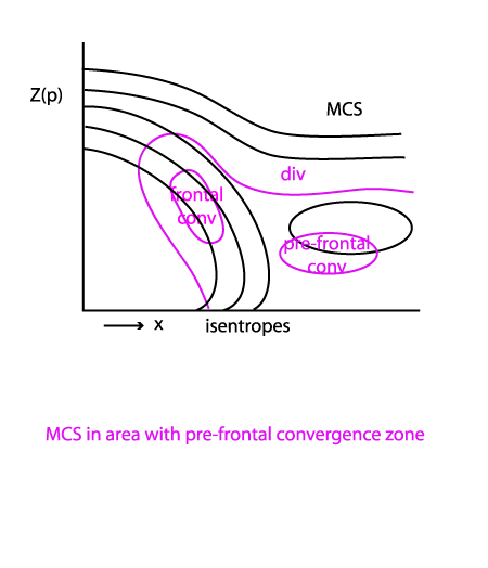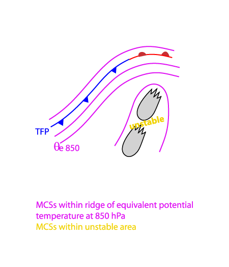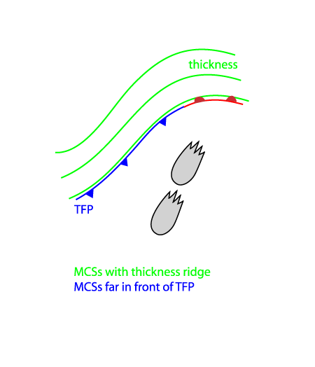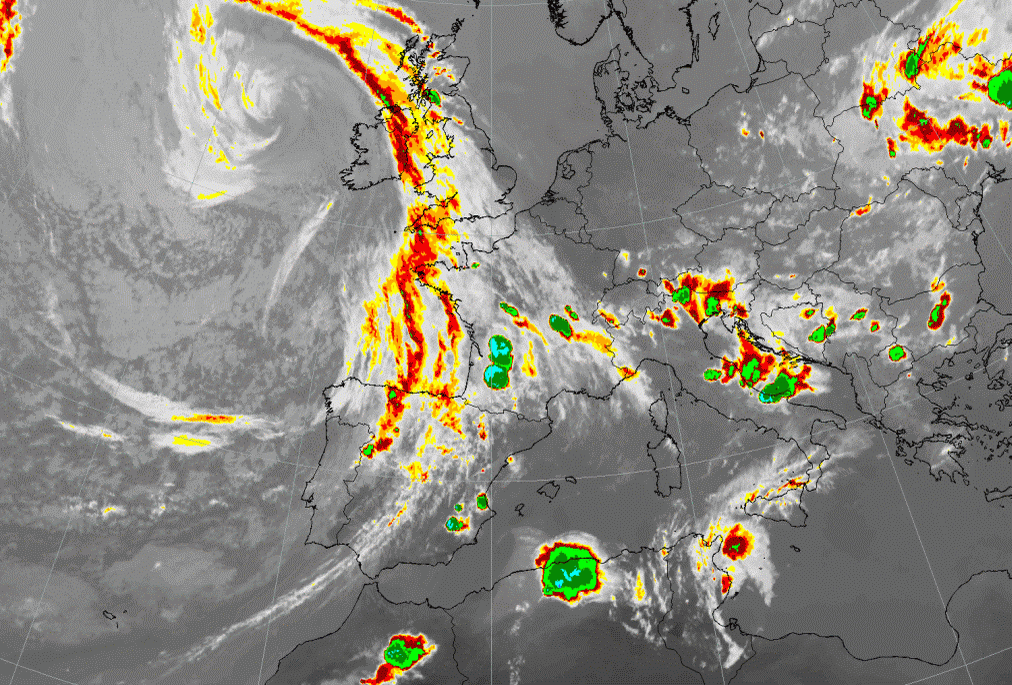 The image below shows Cbs and MCSs over France. They are clearly ahead of the Cold Front cloud band over Northern Spain and the UK and are situated within a thickness ridge, as is typical.