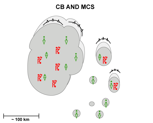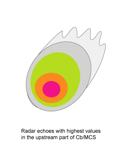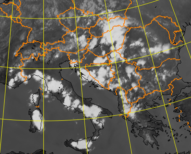 This example shows a big MCS and several Cb's over Southern Europe on the 24th of July 2006 at 14.00 UTC. The anvils appear a little darker in the IR image than the bright deep convective cells.
