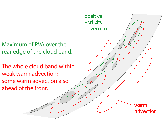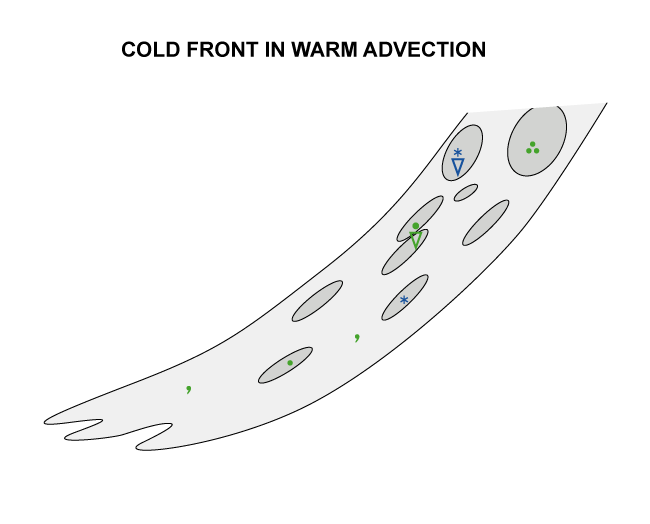 On 03 October 2006 at 12.00 UTC an Occlusion is located over Russia, with a west-east oriented Cold Front. A Warm Front Shield can be seen over Germany; the warm advection ahead of it is overrunning the area of the Cold Front. As a result, a Cold Front in Warm Advection is formed over Poland and Belarus.