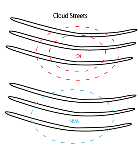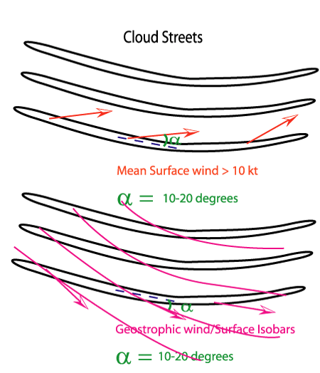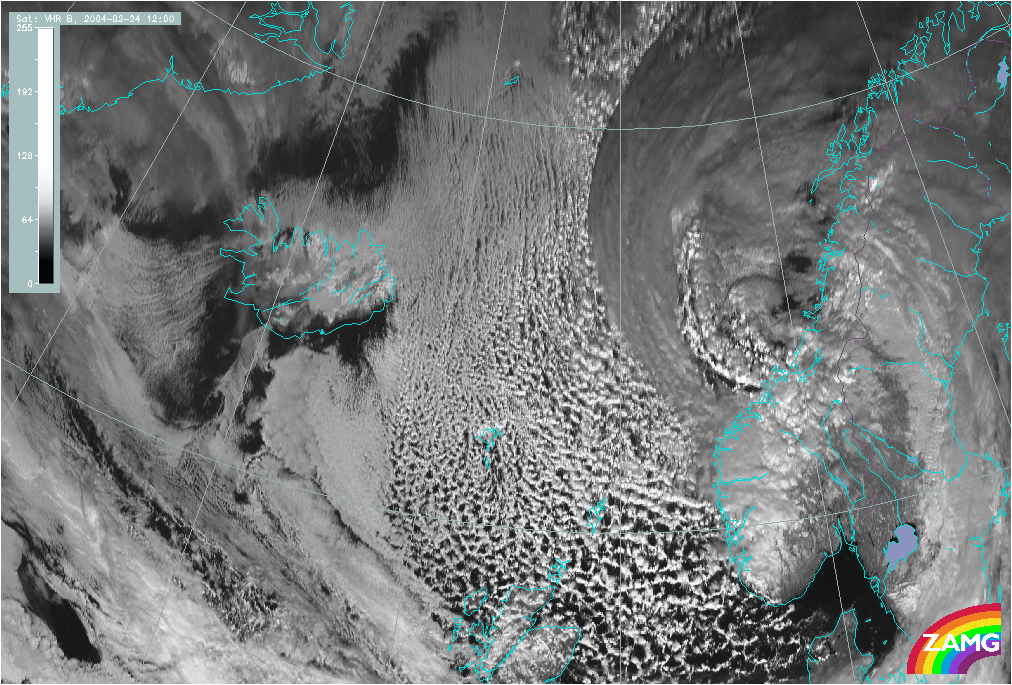 The example shows well developed Cloud Streets near the isle of Jan Mayen (near 70N/10W). Further downstream the development into open cell convection can be seen.