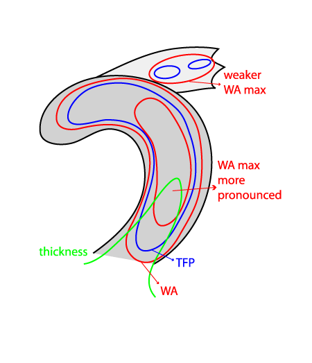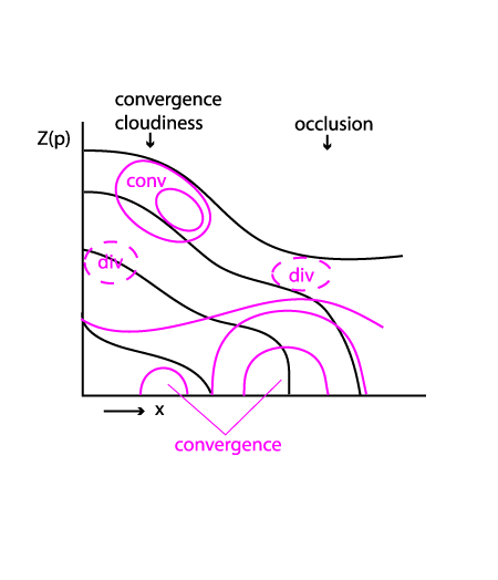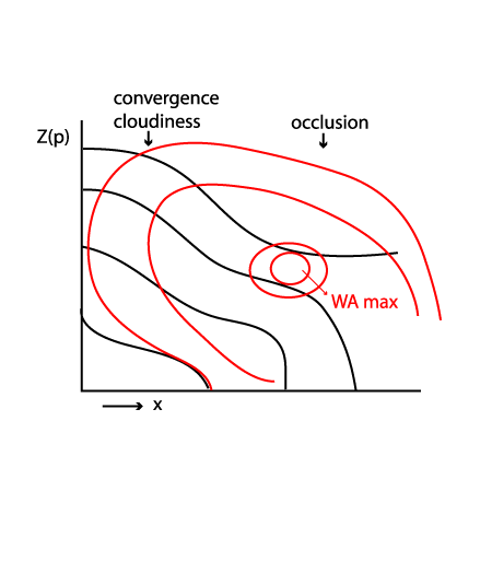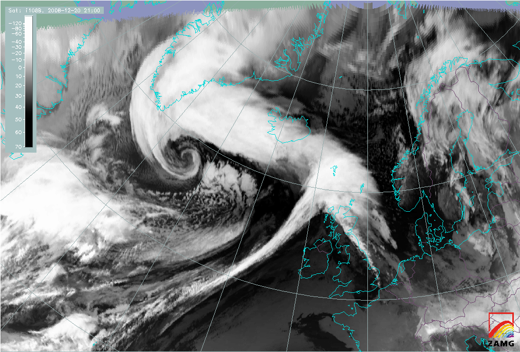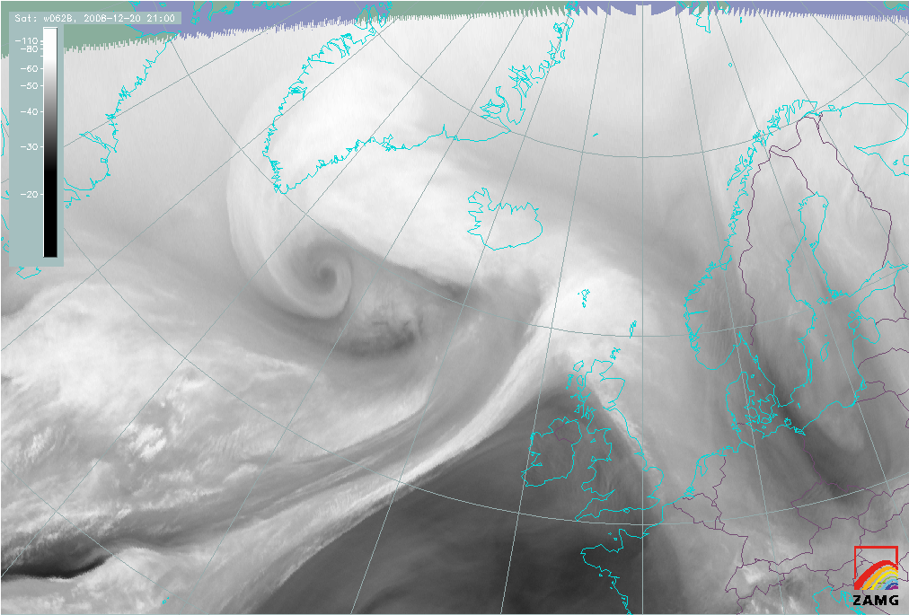The example shows a convergence shield - a cloud shield formed at the end of the occlusion spiral-over Greenland.