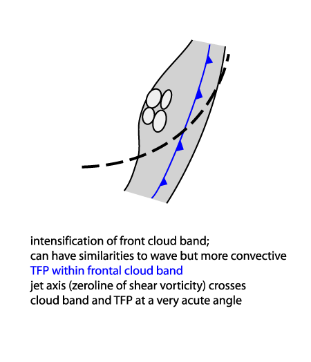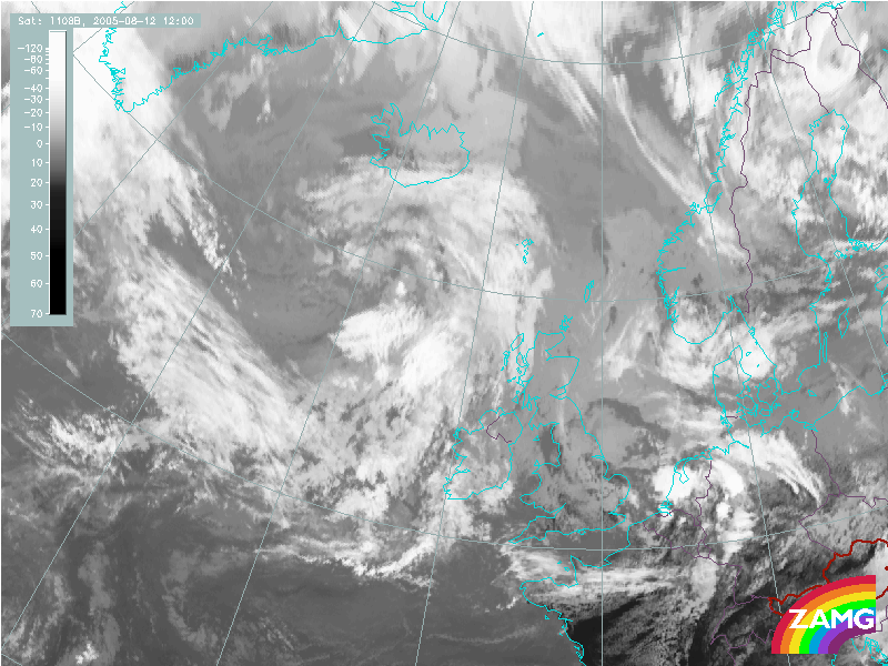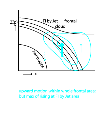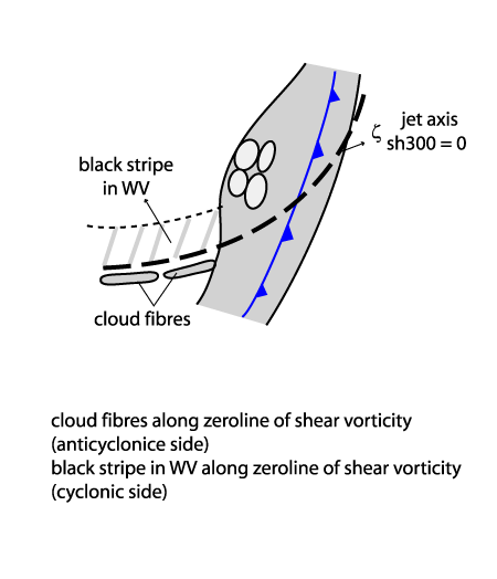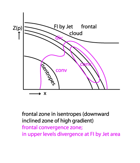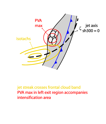 A typical Front Intensification by Jet Crossing cloud area can be seen in the white cloud bulge west of Ireland (57N/18W) over the Atlantic on the rear of the frontal cloud band extending from the Atlantic towards Ireland and further north into the northern Atlantic (Shetland Islands).
