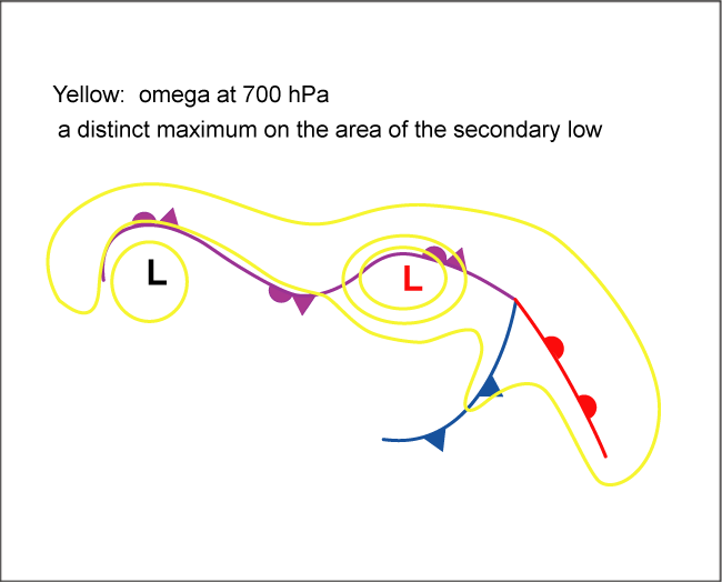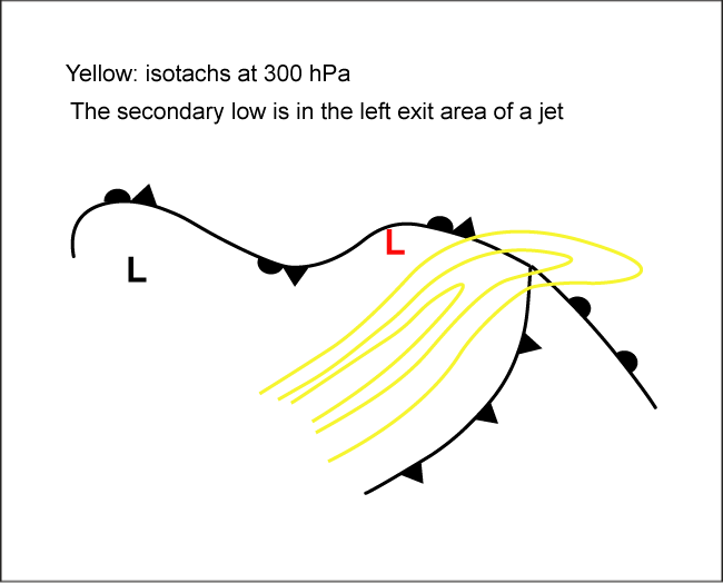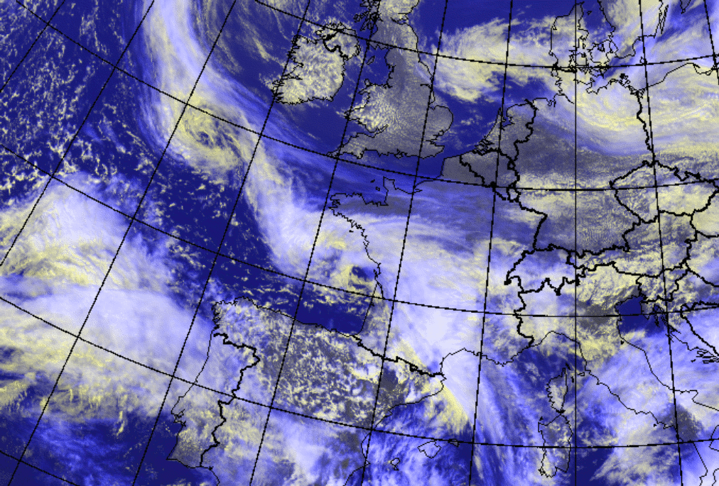 The example shows a cloud vortex indicating a Secondary Low developed in an occluded front over the Bay of Biscay.