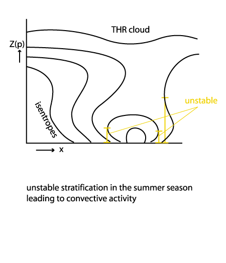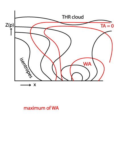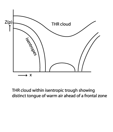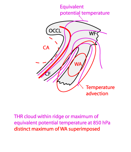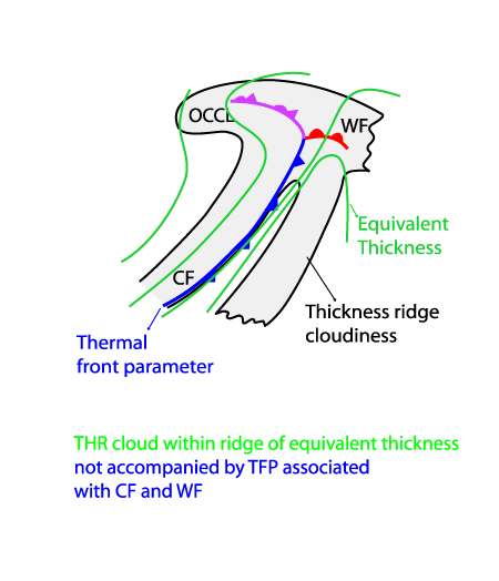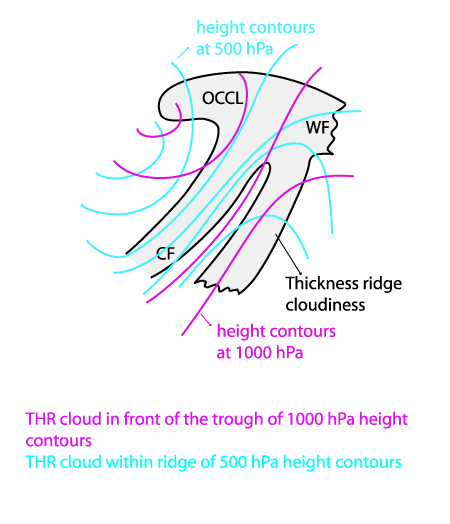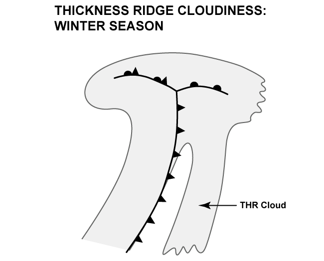 Thickness Ridge Cloudiness (THR) is situated in the warm sector between a Cold Front and a Warm Front. The example shows Thickness Ridge Cloudiness over the Mediterranean Sea.