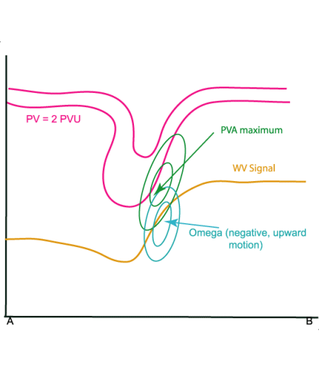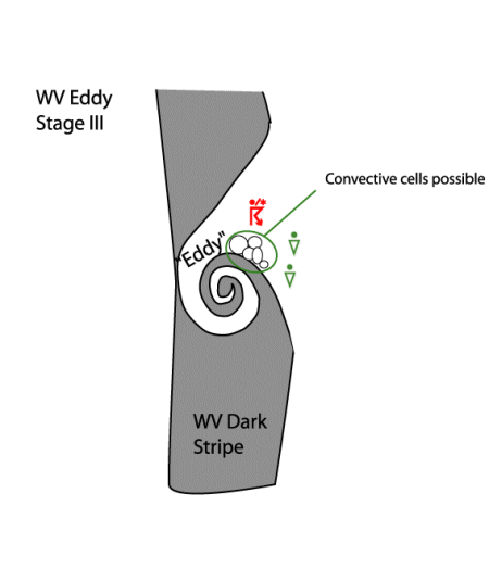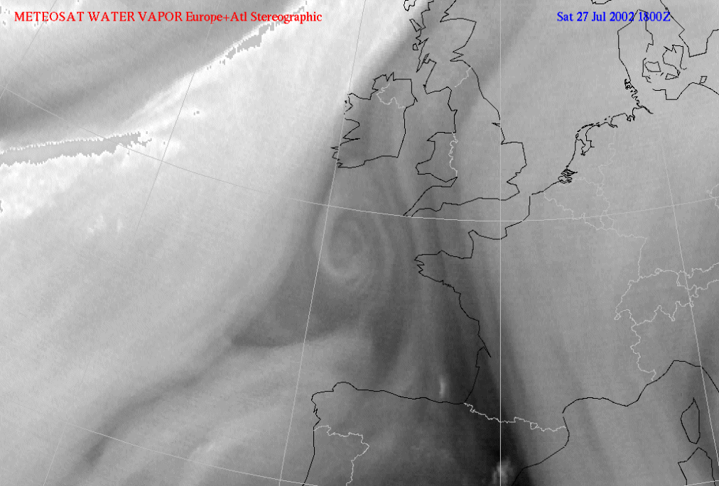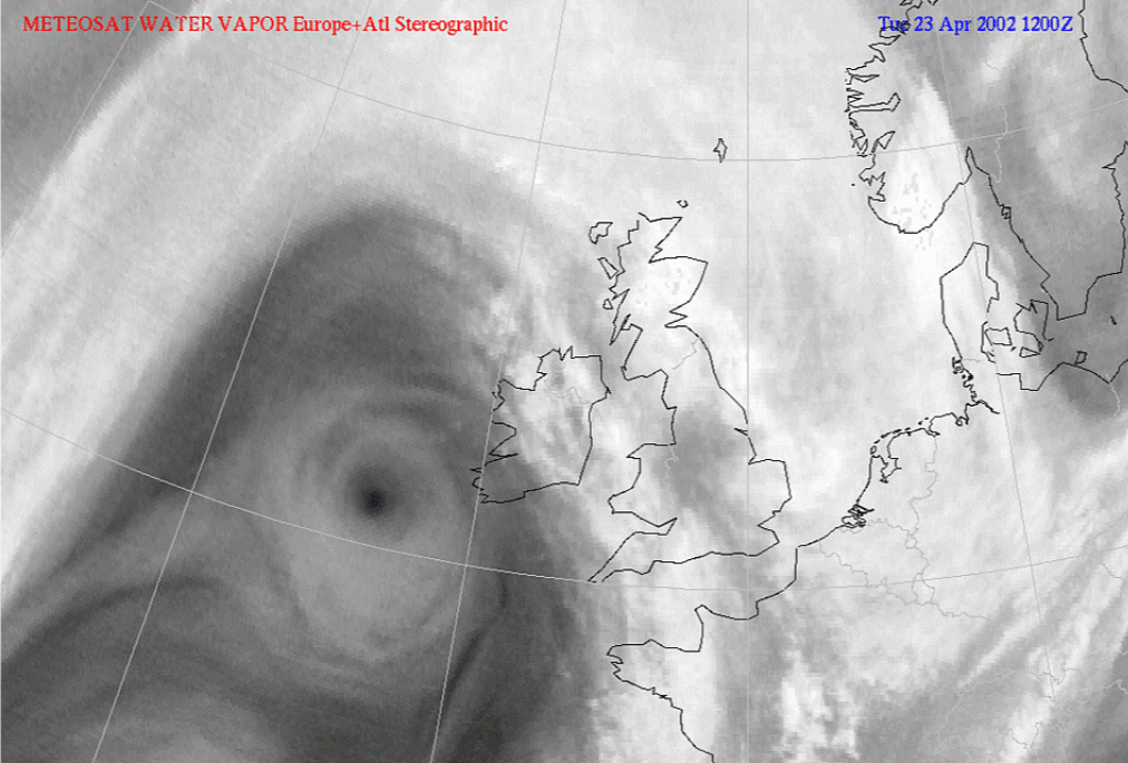 The example shows the two main types of vortex: Above the WV Eddy and below the WV Eye. Both are very well developed and the WV Eddy is situated South of Ireland and the WV Eye over the Atlantic, 50N/15W.