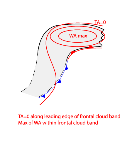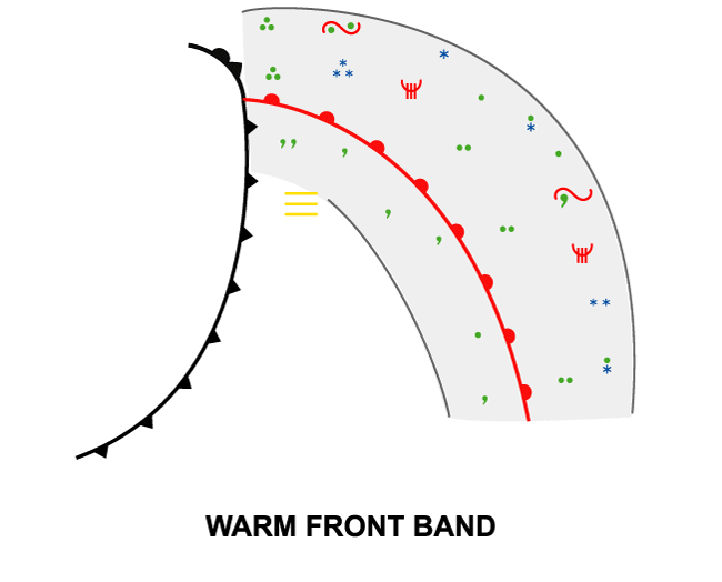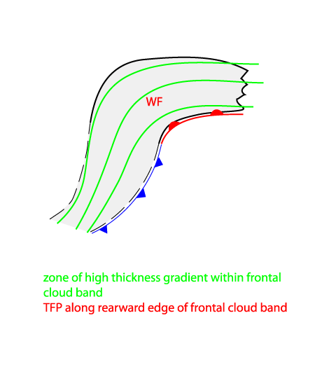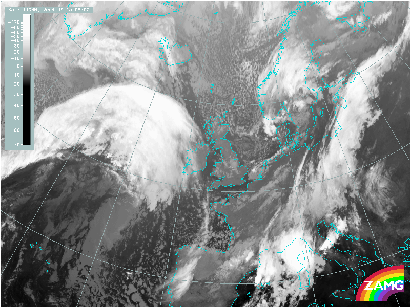 The cloud configuration accompanying the Warm Front Band (WFB) can be seen over the Atlantic extending from south of Iceland (approx 60N/20W) to Norway. In this example the cloud band has a bright texture, partly due to embedded Lee Clouds over Iceland. The Warm Front cloud band is usually much shorter than the connected Cold Front cloud band.