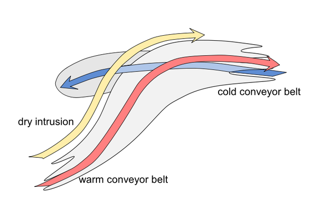 The Warm Conveyor Belt (WCB), the Cold Conveyor Belt (CCB), the Dry Intrusion (DI).