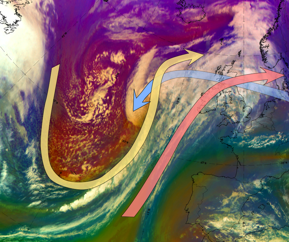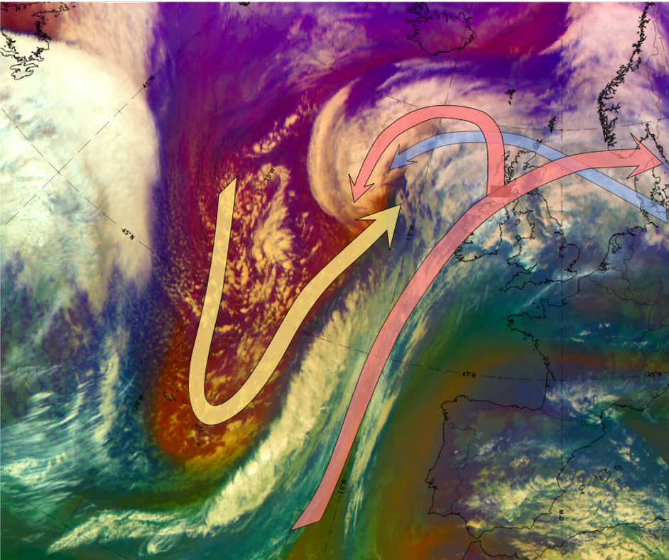A good way to look into Conveyor Belts is the example of a highly developed frontal cloud system presented with the air mass RGB (14 November 2018/ 06 - 12 UTC) in two stages of development.