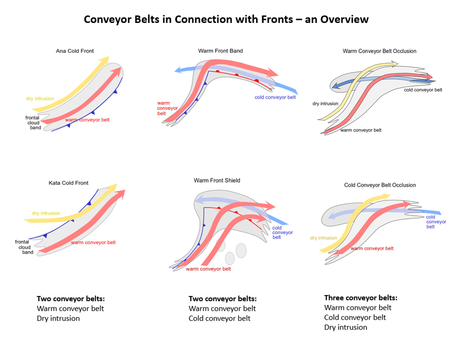 As already mentioned, the conveyor belt theory has been derived from an approach using relative streams. In the above schematics two typical conveyor belts associated with a cold front situation are marked: A warm conveyor belt and a dry intrusion.