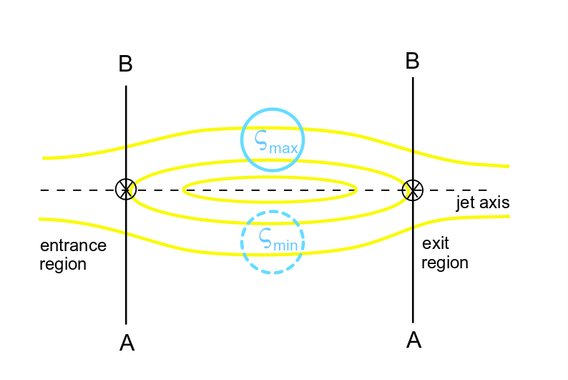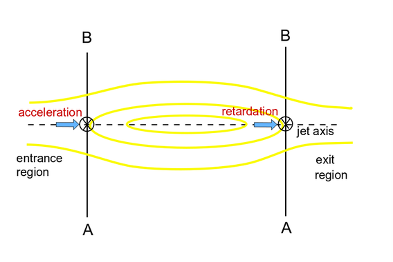 Figure 3: Acceleration area at the entrance and retardation area at the exit of the jet stream