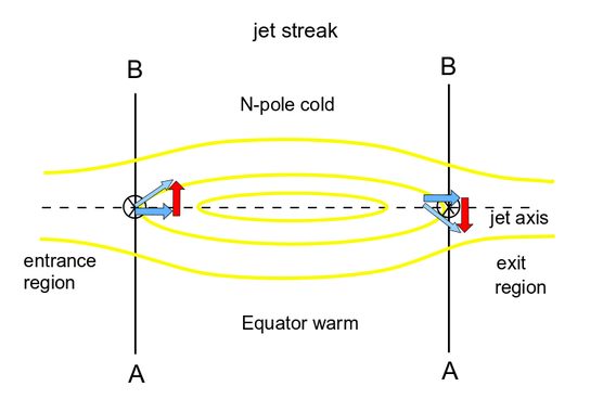 The upstream side of the jet streak is the "entrance region" where air particles enter the jet streak; the downstream side is the "exit region" where the particles leave the jet streak.
