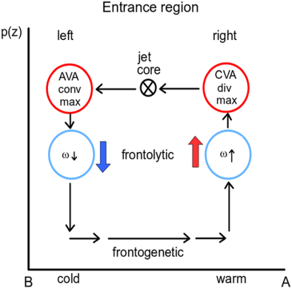 The right entrance region is preferred area for classical wave developments for instance in a cyclogenesis according to the classical polar front theory; they usually can have longer development times. |