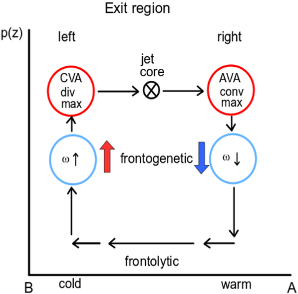 The left exit region is a preferred area for rapid and intensive developments for instance in a rapid cyclogenesis, or for the development of Cold Air Conceptual Models like ECs and commas |