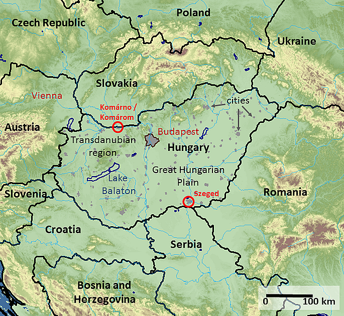 It is now 06:00 UTC. You are beginning your forecaster's shift. You are responsible for issuing forecasts and warnings around Hungary for certain customers. There is a large outdoor festival going on in Szeged and a running competition between the cities of Komárom and Komárno. You can see the locations of the cities on the orography map below. Several thousand people are attending these events and camping on site so it's crucial that the organizers get the warnings in time. They are mainly interested in the possibility of severe thunderstorms, heavy rain, strong wind gusts, hail, etc. The main outdoor programs end at 14:00 UTC.