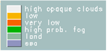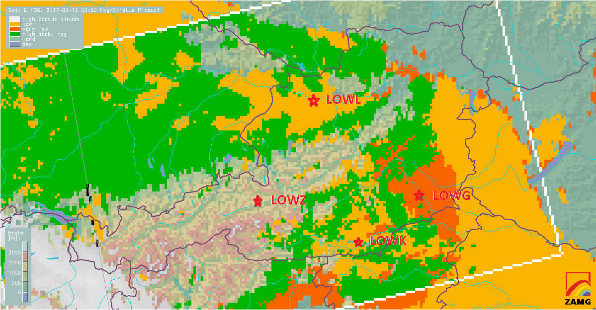 To start with, we use satellite based data to get an overview of the cloud and fog situation in the very morning, here the cloud type fog product at 03 UTC: