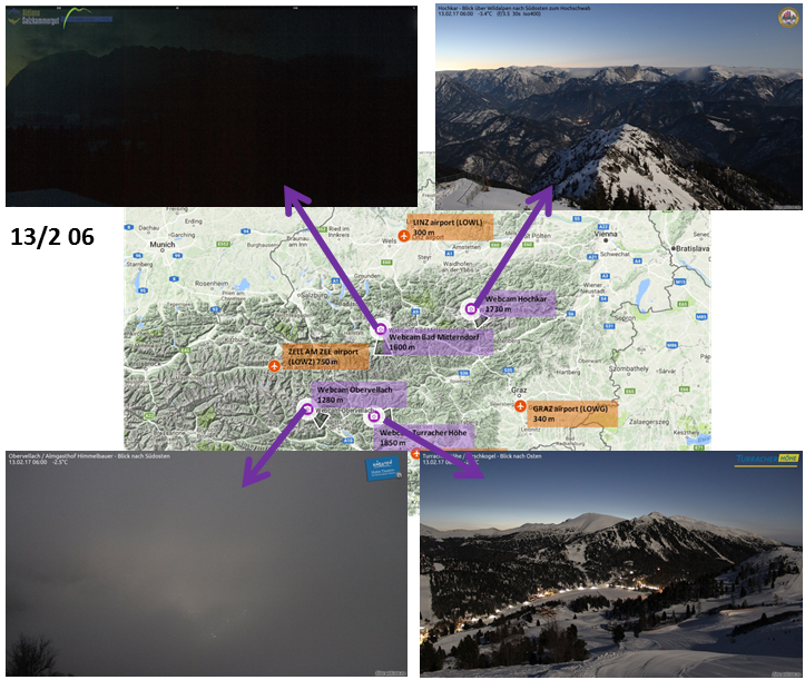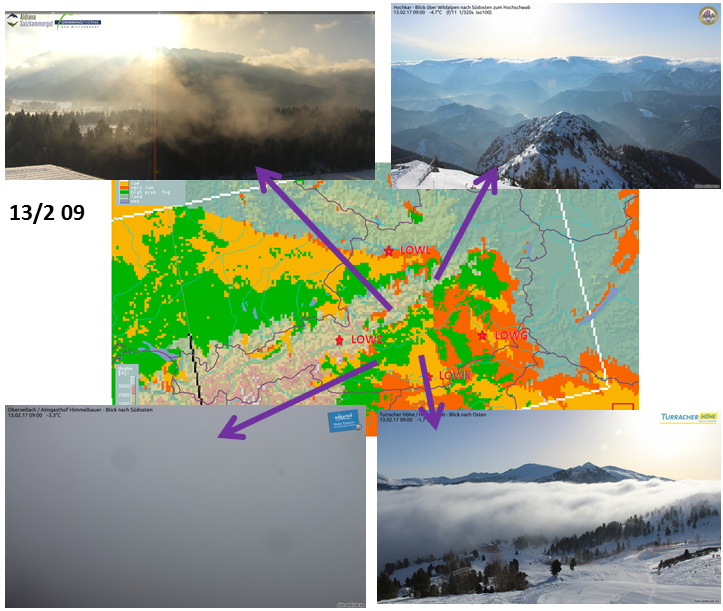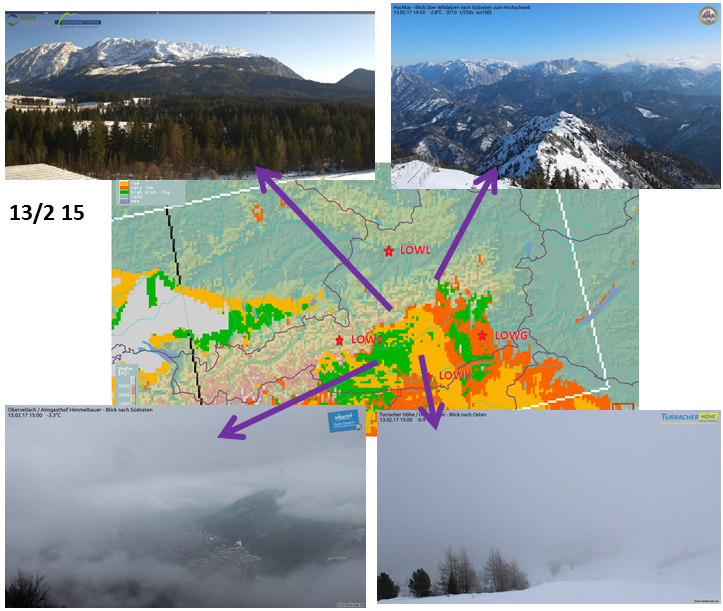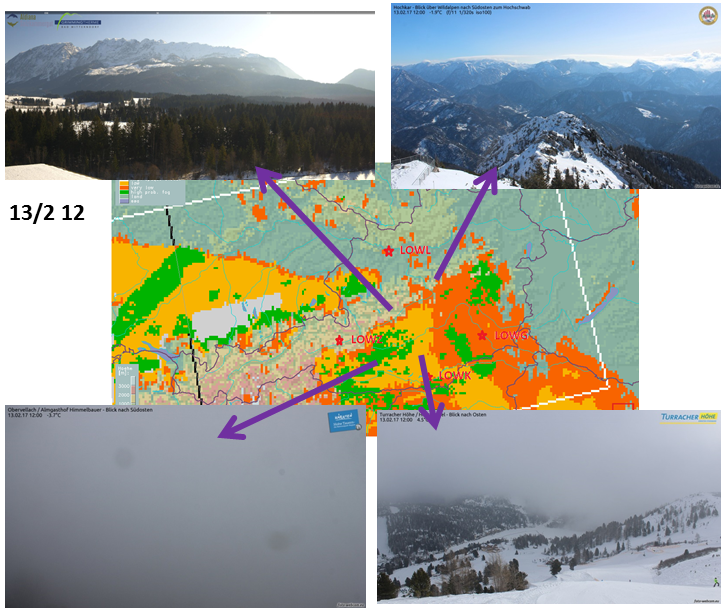The following webcam snapshots from 06, 09, 12 and 15 UTC round out the scenario of dissipating fog in the north and stagnating or densifying fog in the south.