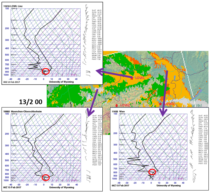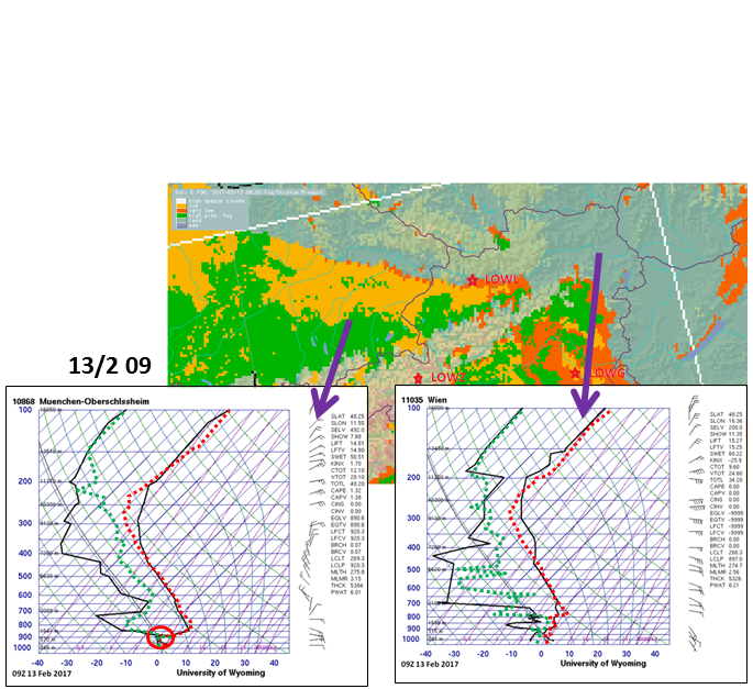 Eventually a look at the radiosoundings at two different time steps (00 and 09 UTC) reveals the dry air intrusion in Vienna and Munich. The 00 UTC measurements are included in the 09 UTC radiosoundings as green and red dotted lines which makes it easier to compare over time. The closer the two lines are the moister is the air at the corresponding level.