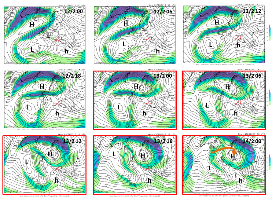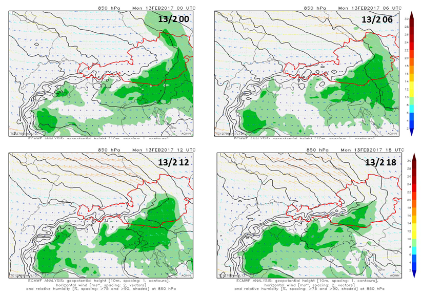 The simulator data first leads you through the larger-scale synoptic patterns. Note here how the upper layer high pressure system moves from Scandinavia to the south, towards Austria. Higher pressure generally means sinking air masses, hence descending dry air from higher levels. This plays a role for our fog situation because a) there is synoptic movement and b) the moist (foggy) air gets slowly replaced by dryer air north of the Alps.