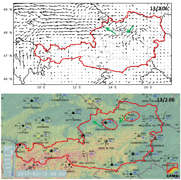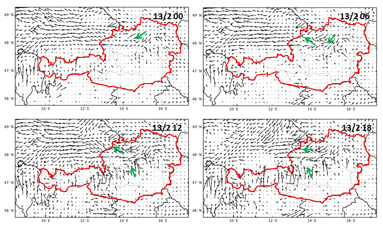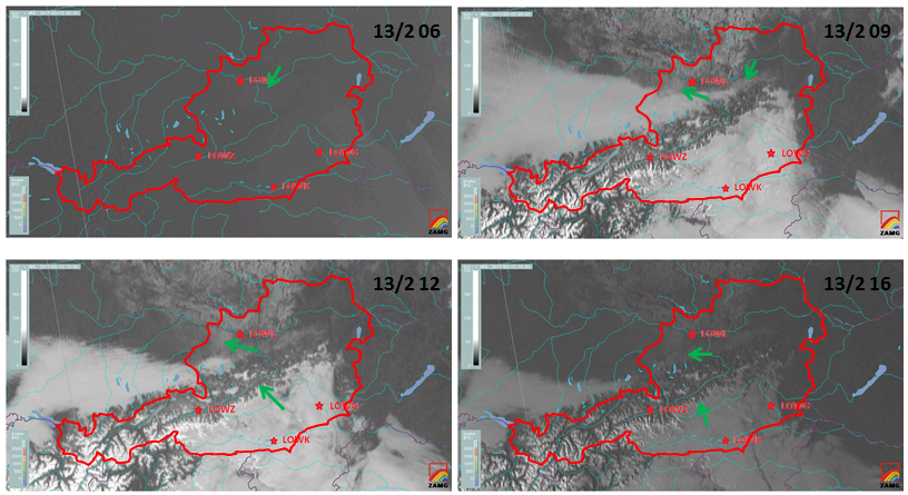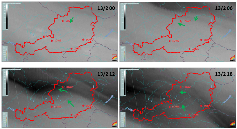 The satellite water vapour (WV 6.2) images from 00 UTC to 18 UTC (images above) show the advection (and subsidence) of dry air in the north-eastern parts of Austria.