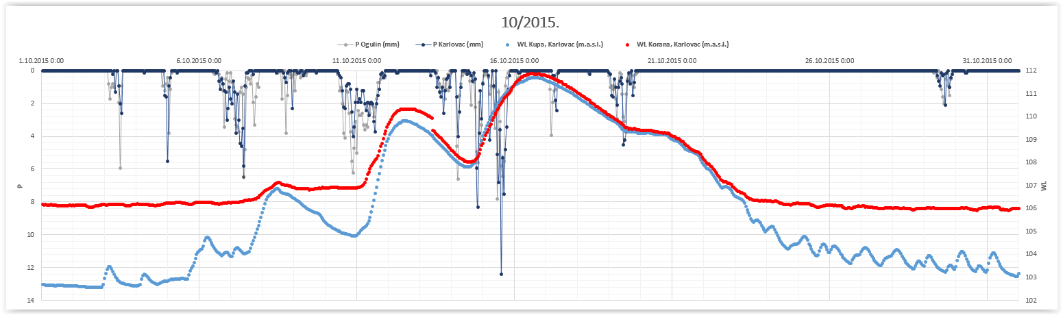 As mentioned in the introduction, the weather situation and precipitation on October 15th was just icing on the top of weather conditions from previous days. Because of frequent rain episodes over the Kupa and Korana catchments the groundwater levels were high as well as soil moisture. That is why the flood was no surprise, but the new record for high water level of river Korana (852 cm) was.