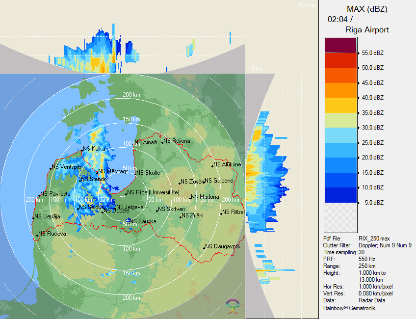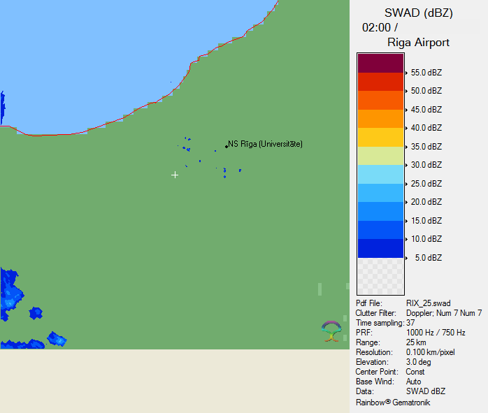 There are many radar products provided in the weather simulator. The radar is located 1-3 km from the airport Riga and around 10 km from the Riga city centre. So the centre of the radar images can be assumed as the place for airport Riga. It is a C-band radar, which covers the territory of Latvia and also northern part of Lithuania and southern part of Estonia. The radar images will refresh every 10 minutes.