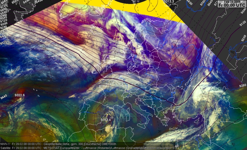 The geopotential height in 300 hPa reveals a pronounced upper air trough over western Europe. However, more relevant is the Central and West Atlantic: From New Foundland to the area south of Iceland the image reveals almost line-orientated countours with a strong gradient that indicates an intense frontal zone. A short wave trough and divergent isolines can be seen south of Iceland. This is a typical structure during a rapid cyclogenesis.