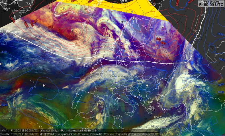 We will use model fields and will not consider possible model errors. We see in this image that the surface low (southwest of Iceland) is already situated north of the jet axis (transiton from purple to blue) and superimposed by high PV (purple colour). The rapid cyclogenesis has already started.