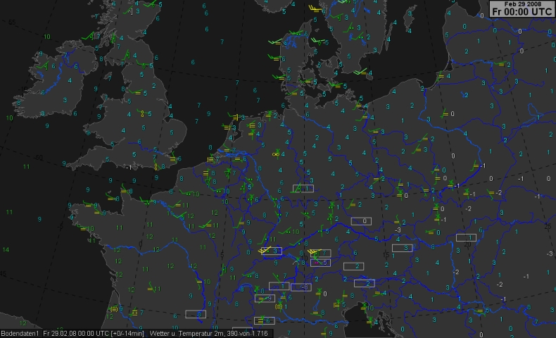 The cold front/occlusion moved very fast to the Southeast and extended at 06 UTC from Central Germany to West France (see surface weather chart). The succeeding convective line became more active. This image reveals line orientated reports about thunderstorms and we see a clear temperature contrast and a significant wind change over Germany and France.