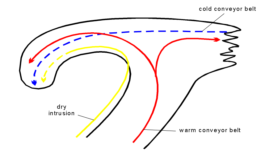 penetrates from below the warm conveyor belt and turns cyclonically forming the cloud spiral. The relative stream of the