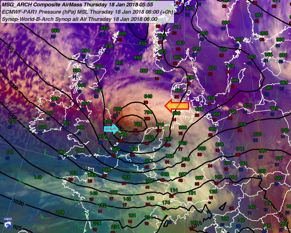 It is often expected that cyclones with this structure are more likely to produce severe weather than in the case of the classic Norwegian model. On the morning of 18 January, the cyclone was in its mature stage and a slot of dry air close to its centre was easily recognizable on the Airmass RGB satellite images (Fig. 3.10).