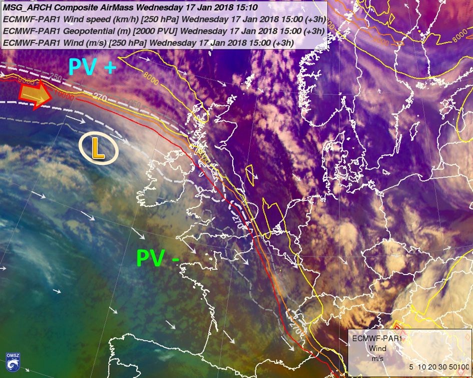 Figure 3.2: METEOSAT Airmass RGB image (background) and ECMWF forecast of 2.0 PVU (Potential Vorticity Unit) height (coloured, solid lines, m), 250 hPa wind speed (dashed lines at 250 and 270 km/h) and wind (arrows, m/s), valid for 17 January 15 UTC. The large arrow indicates the position of the jet streak (maximum wind speed in the upper-air jet). The 2.0 PVU height lines (solid coloured lines, m) mark the folding of the tropopause and distinguish between the regions of cold air mass with high PV (PV+) and warm air mass with low PV (PV-) at upper levels. The cold air mass is bluish in the Airmass RGB, while the warm air mass seems rather to be greenish. The centre of the surface low (marked by the letter L) was just south of an upper-air wave, which started to form on the boundary between the two air masses.