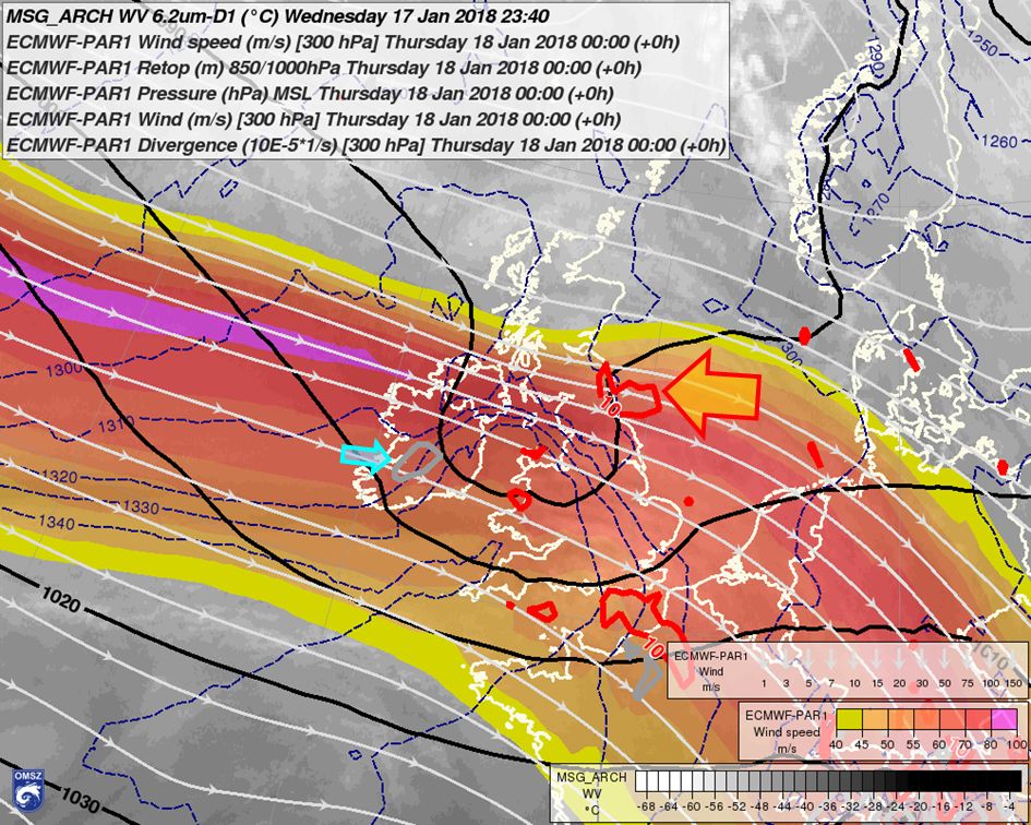 On the afternoon of January 17, the cyclone approached the British Isles and the exit of the jet stream. The Meteosat HRV imagery showed that there were already deeper clouds embedded in the cyclone's head and the IR10.8 μm brightness temperature of the cloud tops was decreasing (by about 10 K within 3 hours). The model outputs also indicated a strengthening of the ascending motion at mid-levels, near the cyclone's centre (Fig. 3.1).
