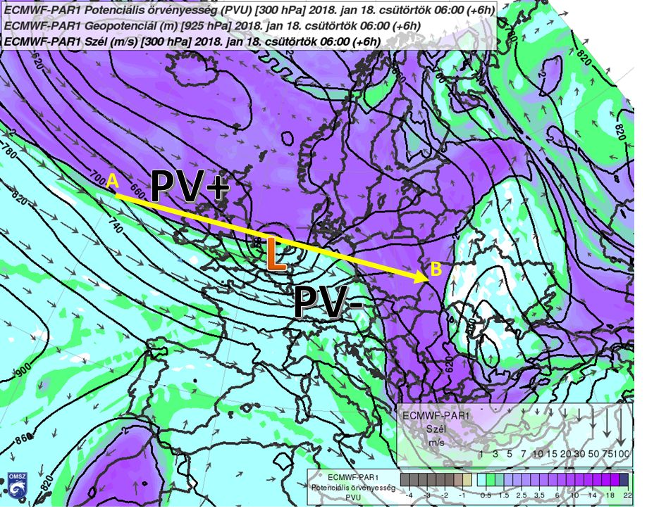 Figure 3.4: ECMWF forecast of 300 hPa potential vorticity (PVU, colour shades), wind (arrows, m/s) and 925 hPa geopotential height (lines, gpm), valid for 18 January 2018 06 UTC (+6h forecast). The lilac colour indicates the high PV in the stratosphere, while the tropospheric low-PV airmass is in light bluish or greenish colours. An upper-air wave started to develop around the cyclone, where the positive (PV+) anomaly extended southward, while the negative (PV-) anomaly extended northward. The A-B line shows the position of the cross-section in Fig. 3.5.