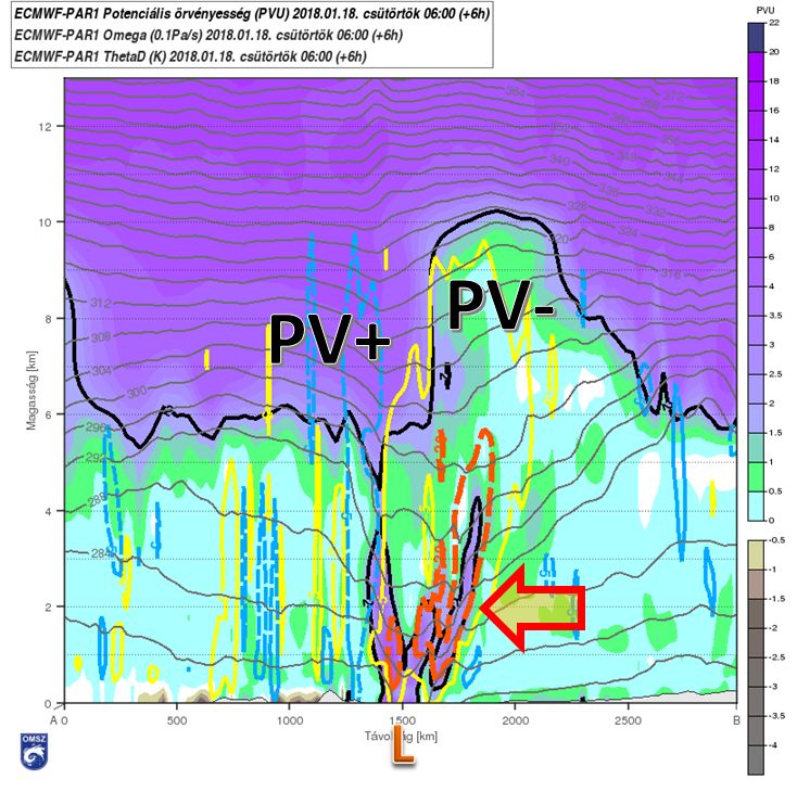 On January 18, a wave developed on the upper-air PV field (Fig. 3.4). This wave could be clearly identified also on vertical cross-sections through the centre of the cyclone (Fig. 3.5).