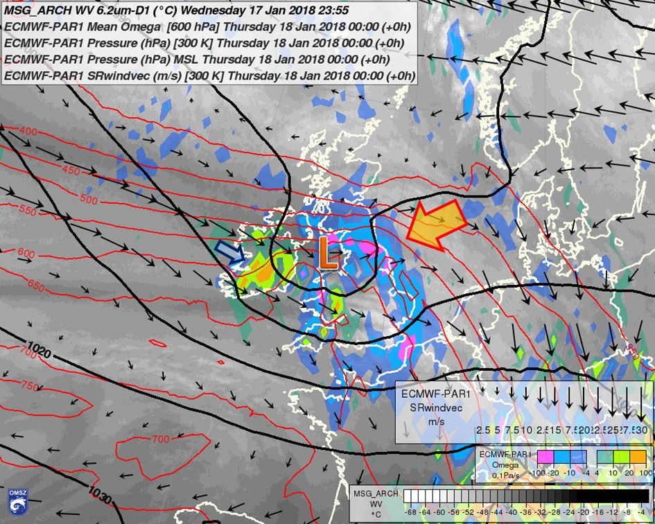 Figure 3.8: METEOSAT WV6.2 image (background), ECMWF mean vertical motion (Omega at 800, 850 and 900 hPa, colour shades, Pa/s), 850 hPa potential temperature Theta (thin lines, every 2 K), mean sea level pressure (thick black lines, hPa), surface cyclone-relative wind at 850 hPa (arrows, m/s), valid for 18 January 2018 00 UTC (analysis). The small arrow points toward a region of strong downward motion at mid-levels, where the 850 hPa temperature gradient vanished. This is a typical feature of the Shapiro-Keyser (1990) cyclone model. There was convergence in the upper-air levels (refer to Fig. 3.3).