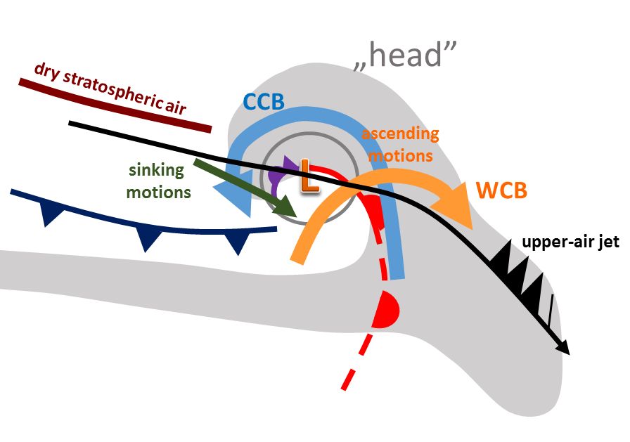 Figure 3.9: A schematic depiction of airflows and belts during the mature stage of the cyclone around 18 January 2018 00 UTC and subsequent hours. The meanings of the abbreviations are the same as in Fig. 2.10b. Note the cold front detached from the system as in the Shapiro-Keyser cyclone model. The occlusion is depicted as a cold front in some conceptual models (pointing toward the cyclone's centre).