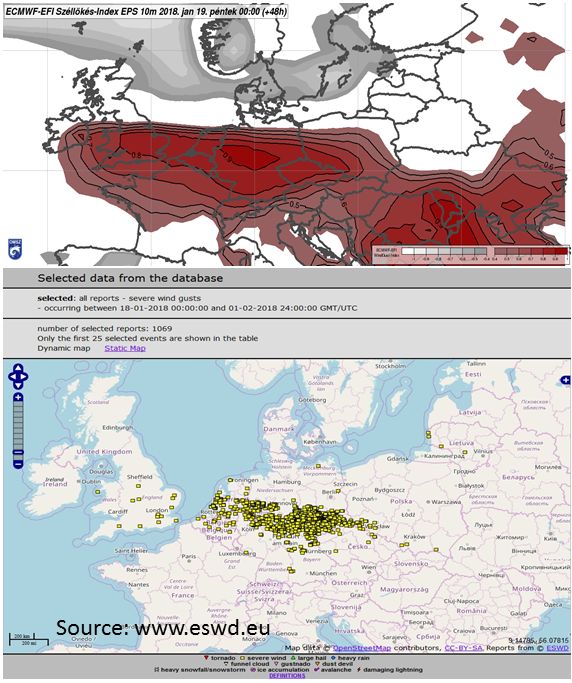 Bottom: Reports of severe weather on the European Severe Weather Database (ESWD) webpage relating to 18 January 2018.